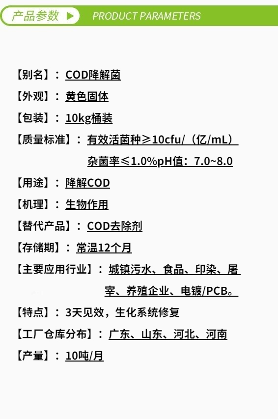 庫巴魯®COD激活菌301是針對生化系統(tǒng)中COD專門研發(fā)的高效COD去除菌,能降解廢水中的蛋白質(zhì)、淀粉、纖維素、糖類、油脂等碳氫化合物,提升優(yōu)勢菌群,有效抑制病原性微生物的繁殖。推薦閱讀:滲濾液COD去除劑—清源牌