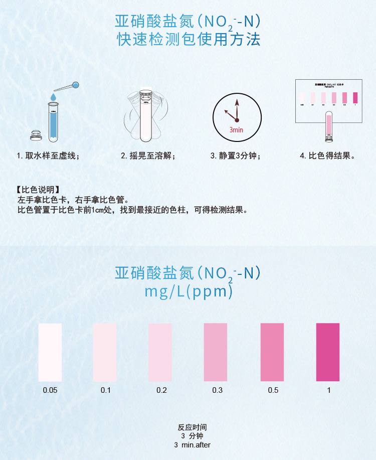2.本產(chǎn)品檢測(cè)水中亞硝酸鹽氮(NO2- -N)含量在0.05-1mg/L(ppm)范圍內(nèi),若要檢測(cè)0.5mg/L以上濃度水樣,請(qǐng)預(yù)先稀釋水樣后再進(jìn)行測(cè)定,具體操作見(jiàn)稀釋說(shuō)明書(shū)。