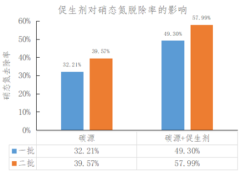 促生劑對(duì)反硝化脫氮的促進(jìn)作用:以某廠化工污水生化處理過(guò)程中的脫氮效果為例,添加水體十萬(wàn)分之一的促生劑能夠提升17.09%-18.42%的硝態(tài)氮脫除率。